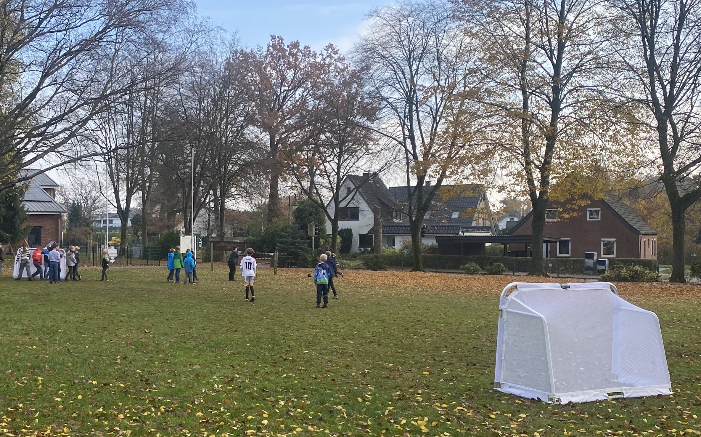 Die Kinder dürfen in zwei großen Pausen vor der Schule auf der Wiese spielen und freuen sich riesig.